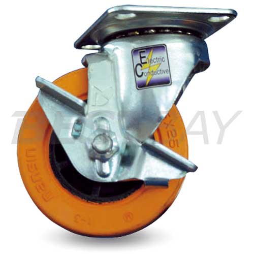 是一种防静电脚轮,保护搬运物品不带静电。因为可以除去与地面摩擦而产生的静电,所以适用于精密机器的搬运,各种医疗设备。(聚氨脂车轮由于不含碳素,不会弄脏地面)
